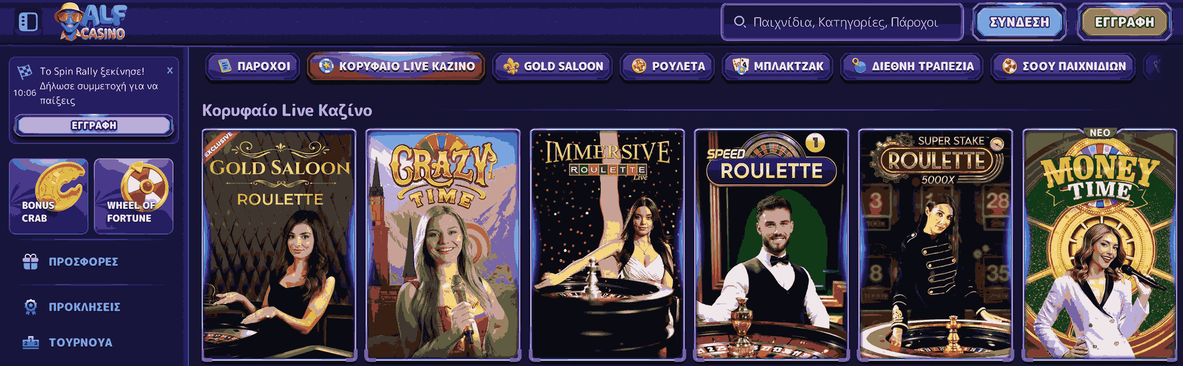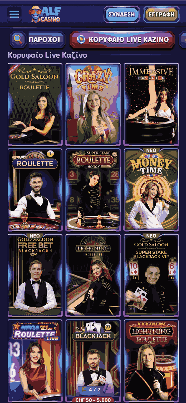 Η καρτέλα Live Casino του AlfCasino διαθέτει πολλά δημοφιλή παιχνίδια με πραγματικούς κρουπιέρηδες, όχι όμως ακόμα επιλογές στην ελληνική γλώσσα.