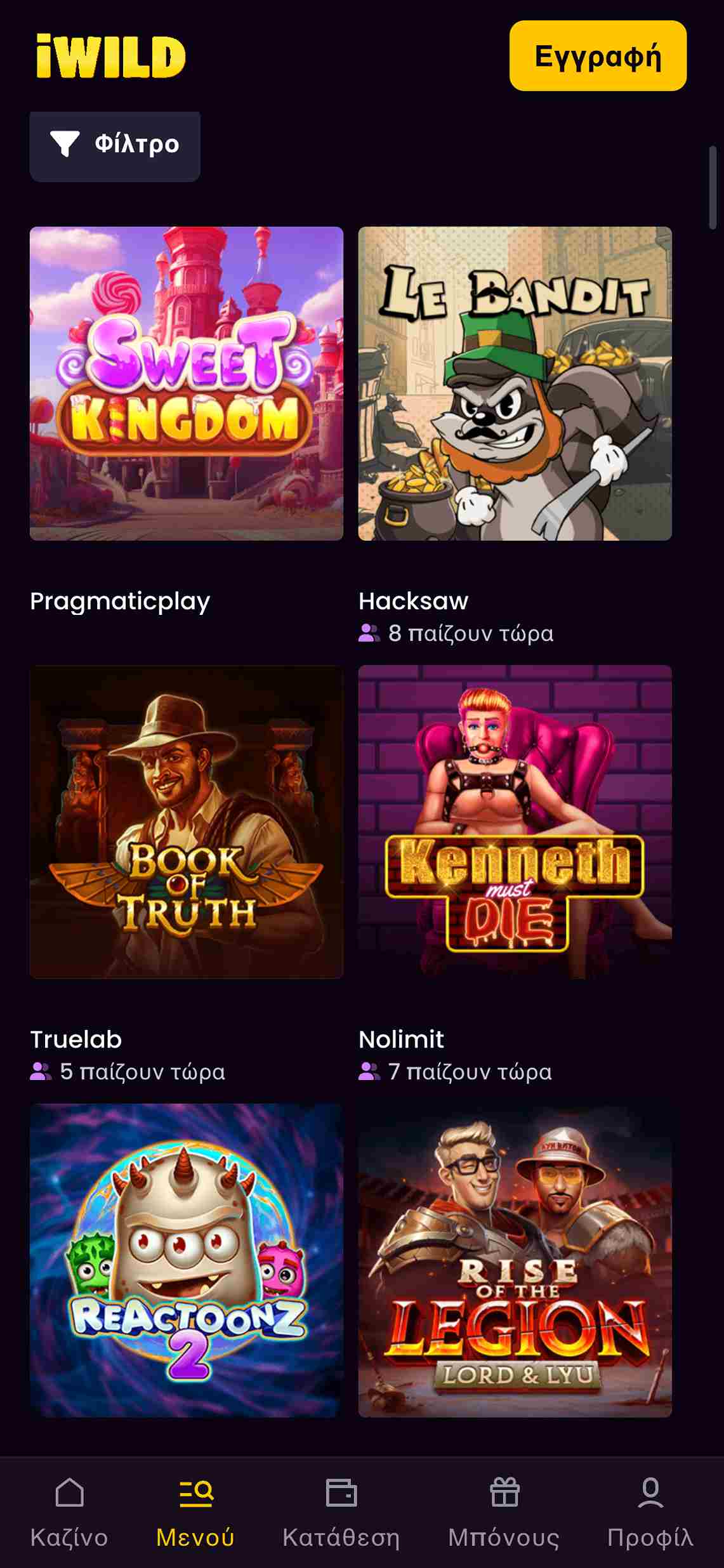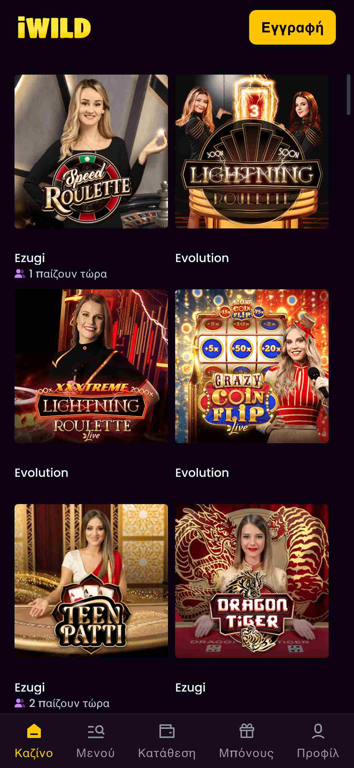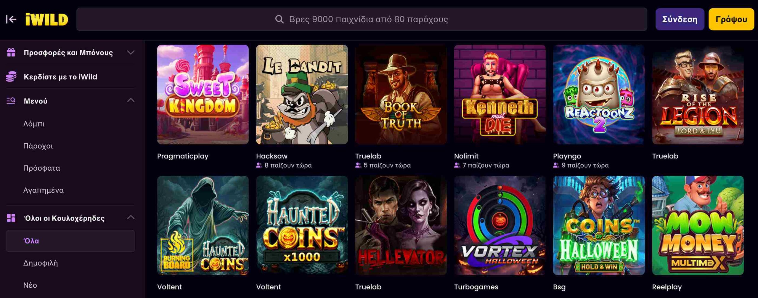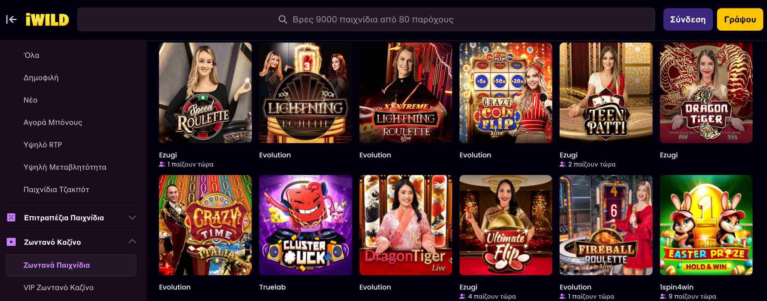 Στο καζίνο του iWild σας περιμένουν πάνω από 9.000 επιλογές σε διάφορα παιχνίδια, από κουλοχέρηδες μέχρι crash games, επιτραπέζια RNG, αλλά και τίτλους απέναντι σε πραγματικούς κρουπιέρηδες.