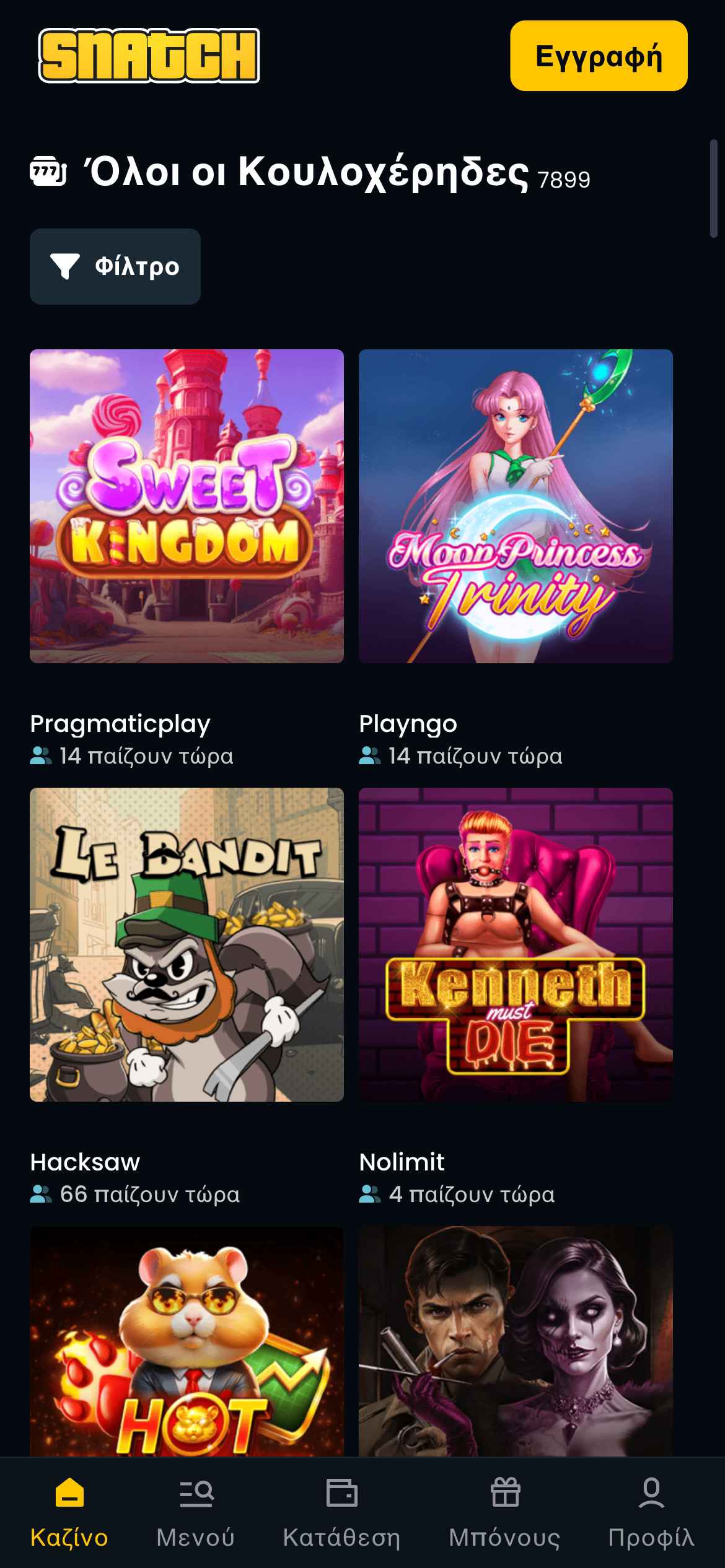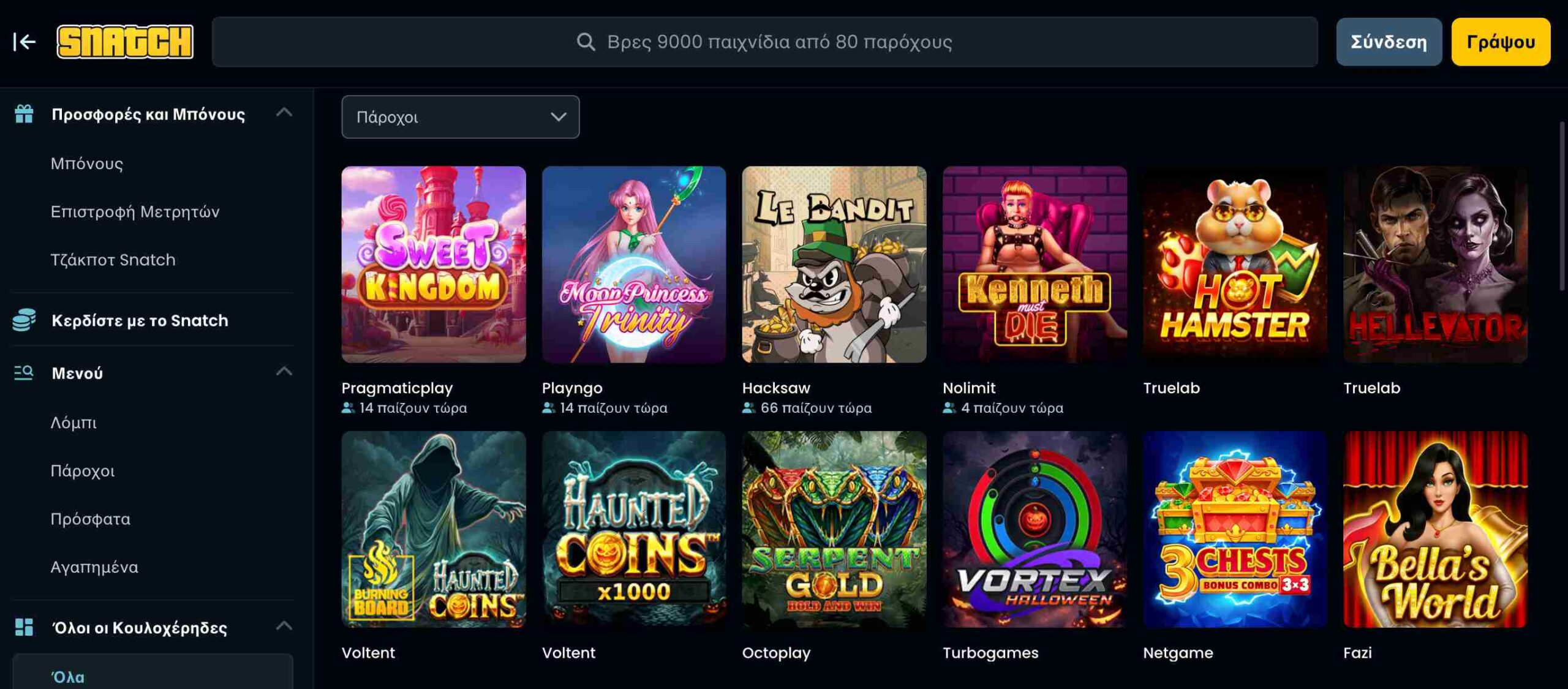 Με περισσότερους από 9.000 τίτλους που προέρχονται από 80+ κορυφαίους παρόχους, το Snatch Casino προσφέρει μια από τις πληρέστερες λίστες παιχνιδιών στην αγορά. Από κλασικά φρουτάκια έως μοντέρνους τίτλους, δεν υπάρχει κάποια κατηγορία όπου η πλατφόρμα υστερεί.