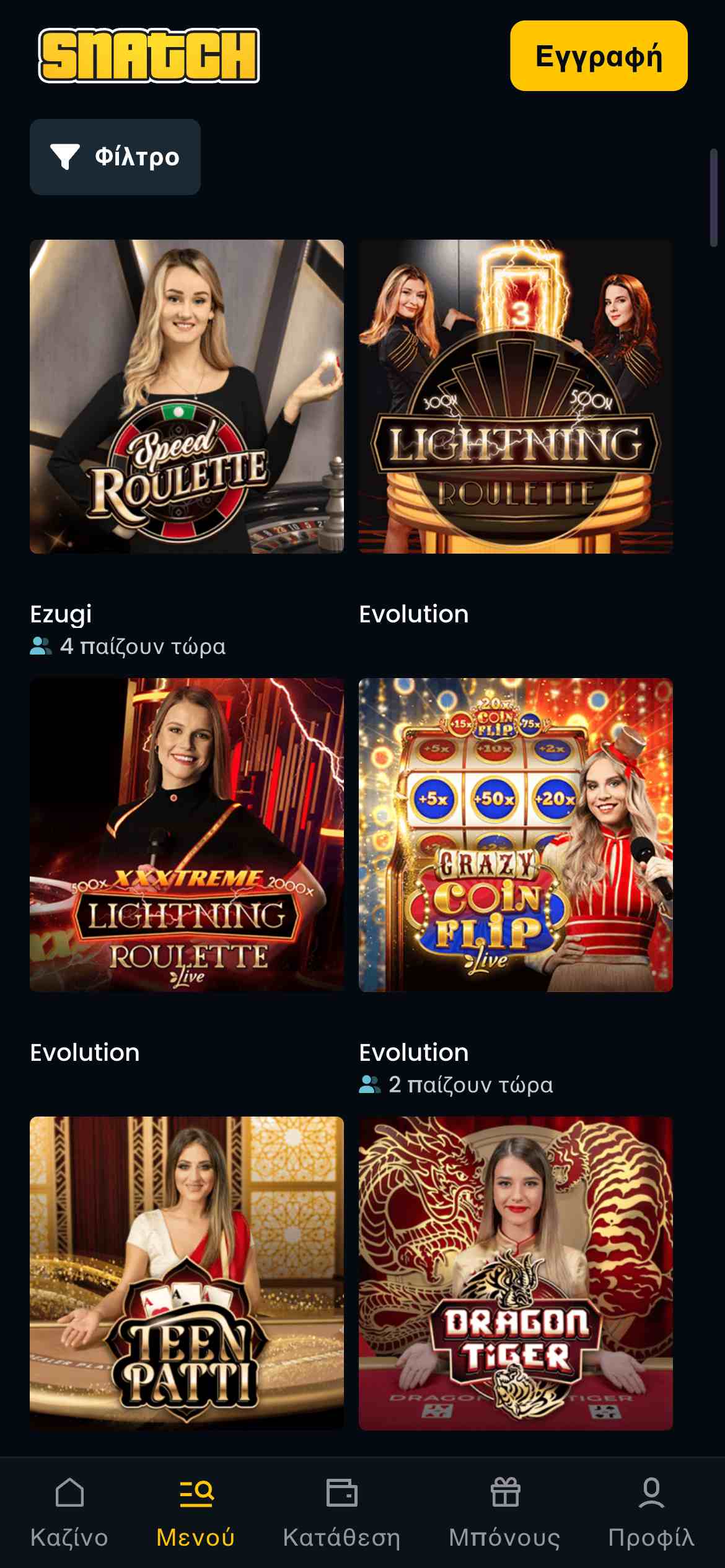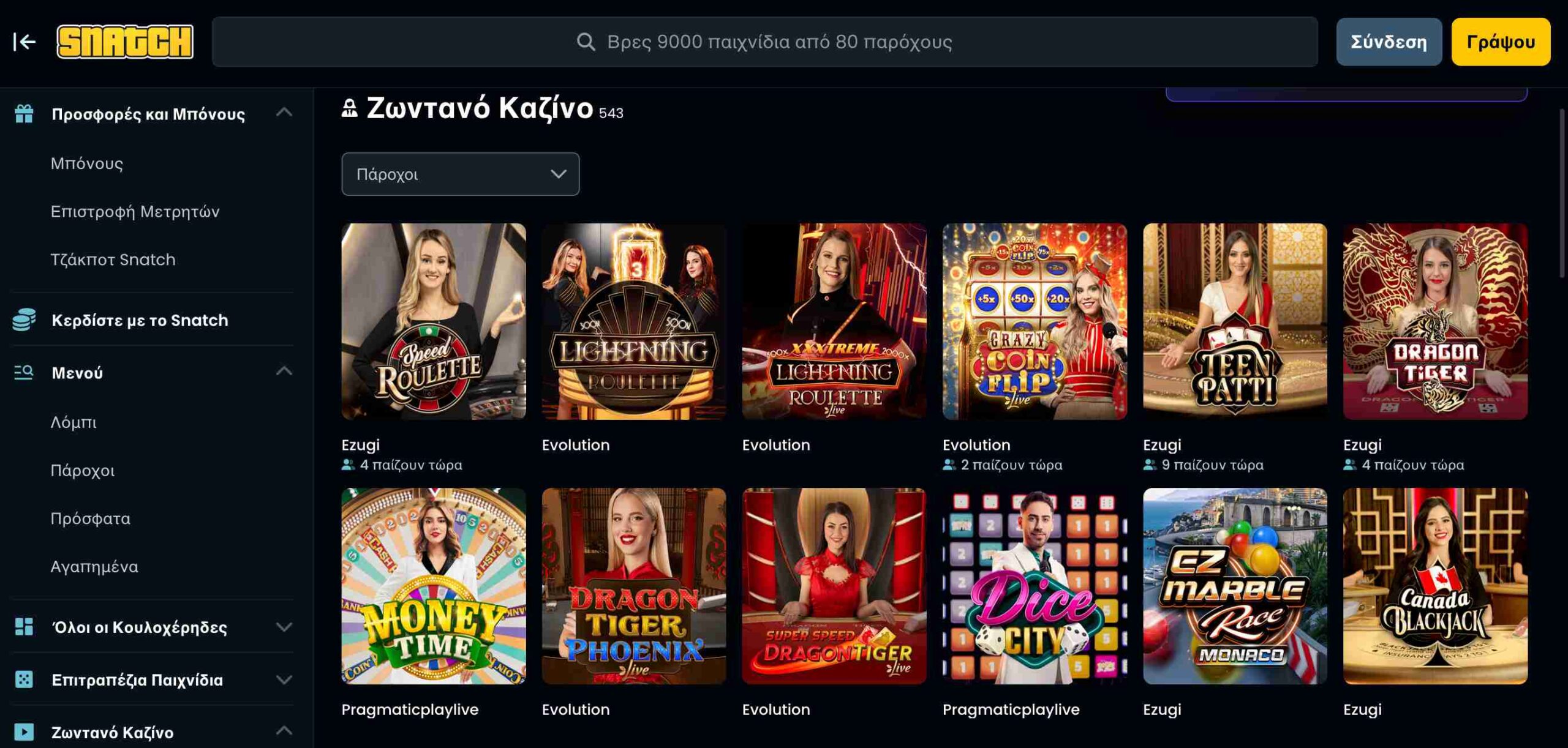 Το Snatch Casino προσφέρει πάνω από 500 τραπέζια με πραγματικούς ντίλερ. Η πλατφόρμα συνεργάζεται αποκλειστικά με τα κορυφαία στούντιο της αγοράς, όπως η Pragmatic, η Evolution και η Ezugi.