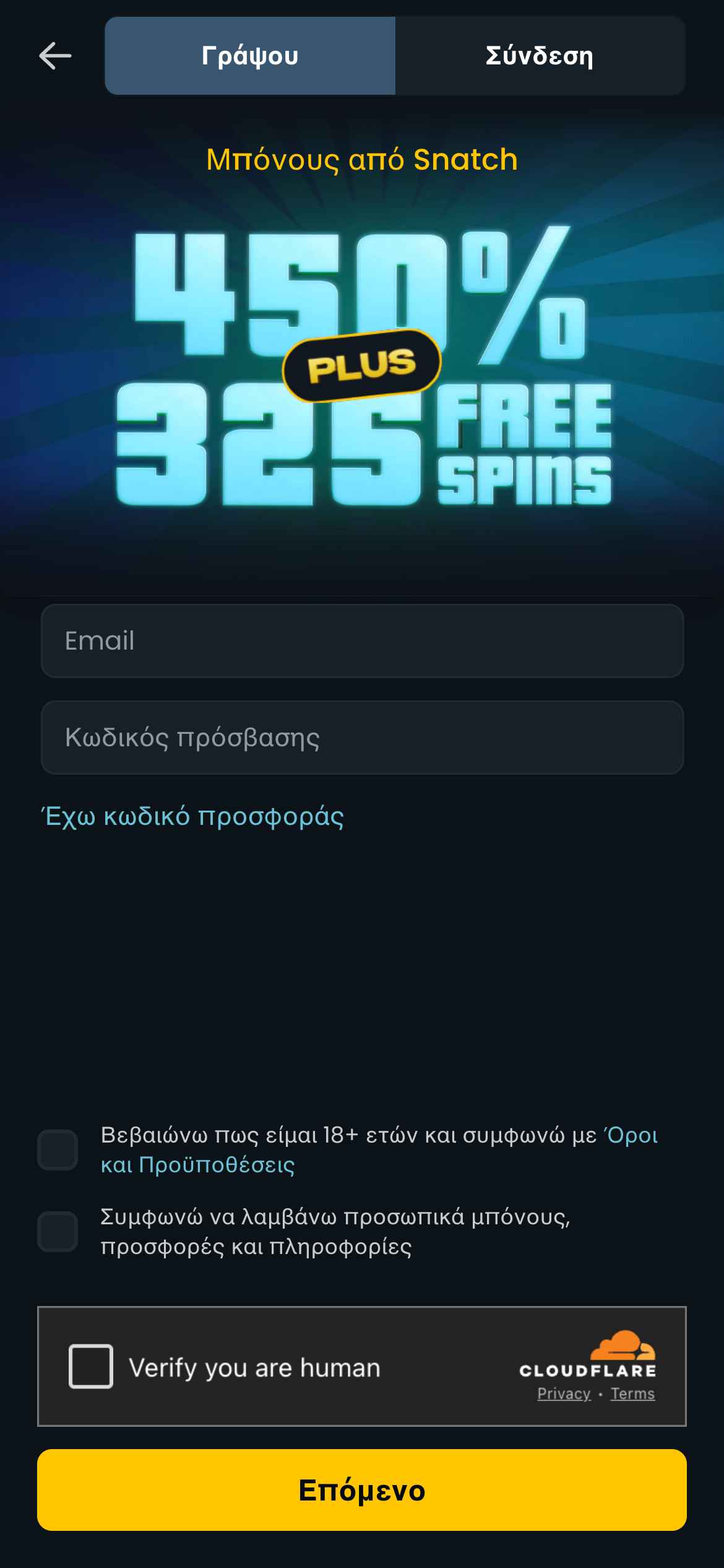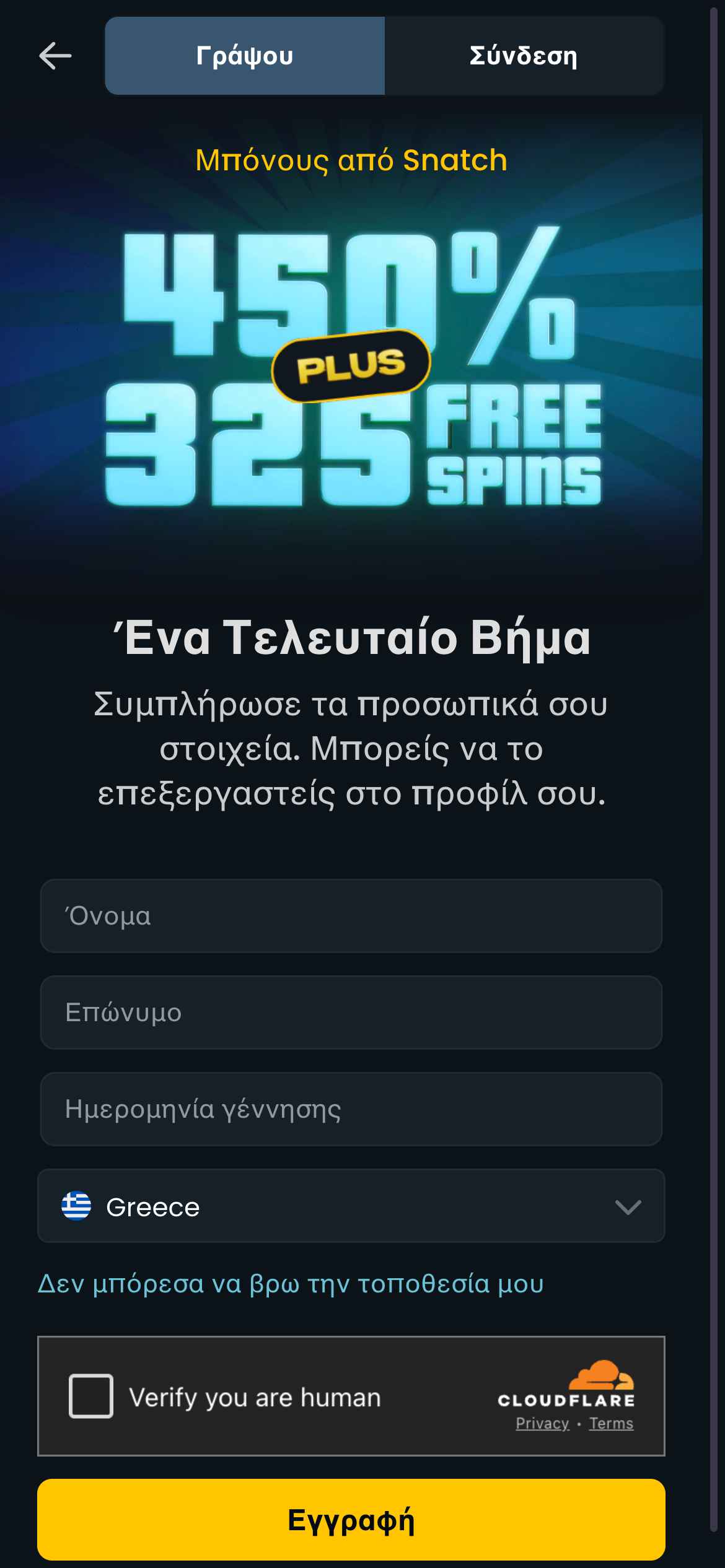 Η εγγραφή στο Snatch Casino είναι απλή και διαρκεί μόνο λίγα λεπτά. Το μόνο που χρειάζεται είναι να πατήσετε το κίτρινο κουμπί «Γράψου», που βρίσκεται στο επάνω δεξιά μέρος της σελίδας.