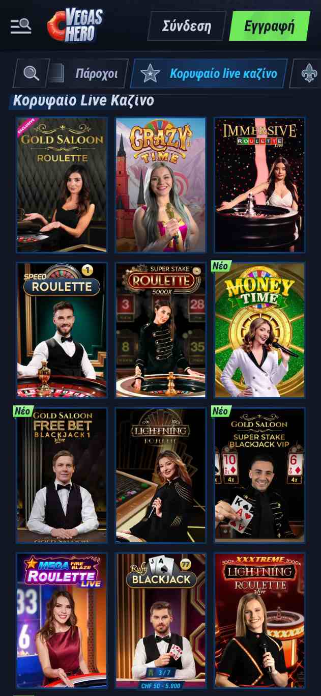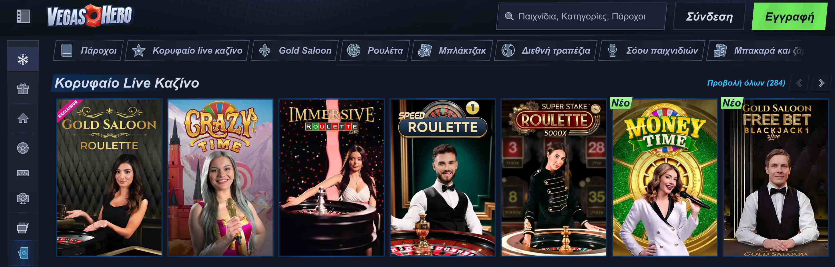 Το VegasHero διαθέτει σε ξεχωριστή ενότητα την καρτέλα του Live Casino, η οποία διαθέτει παιχνίδια σε ζωντανή μετάδοση (live streaming), τα οποία φιλοξενούνται από πραγματικούς κρουπιέρηδες.