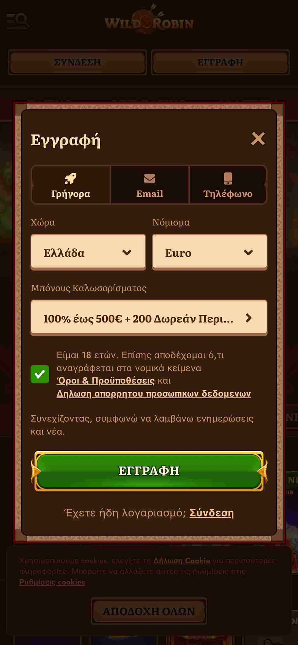 Επιπλέον, πριν μπορέσετε να πατήσετε το κουμπί της εγγραφής για τη δημιουργία του λογαριασμού σας, θα πρέπει να δηλώσετε ότι έχετε ξεπεράσει το 18ο έτος της ηλικίας σας, αλλά και ότι είστε σύμφωνοι με τους όρους και τις προϋποθέσεις, καθώς και με τη δήλωση απορρήτου προσωπικών δεδομένων της Wild Robin.