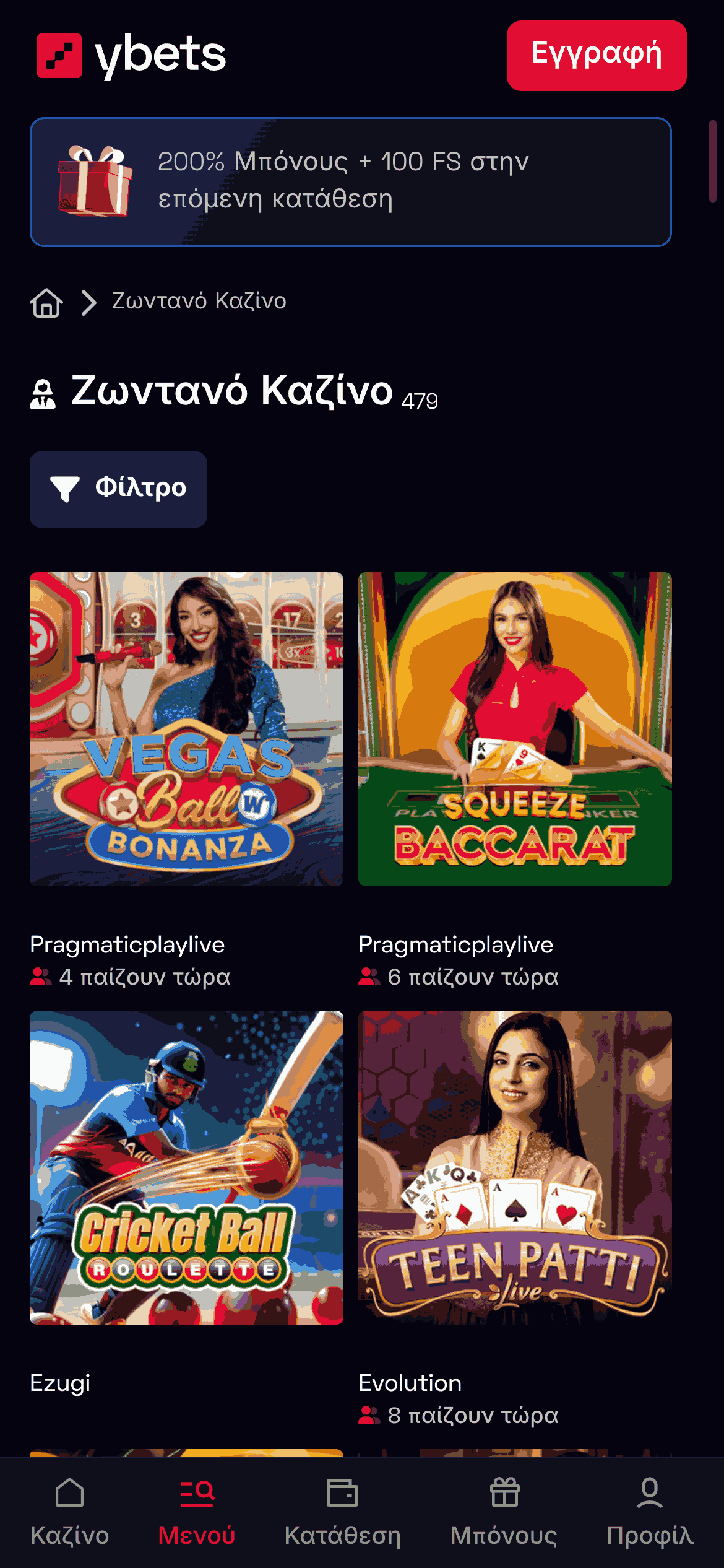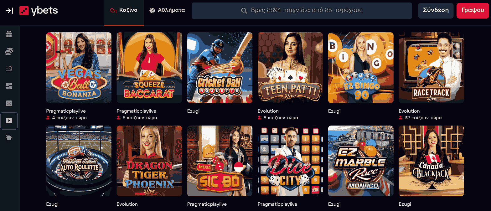 Η πλατφόρμα του Ybets έχει ξεχωριστή ενότητα για το ζωντανό καζίνο με σχεδόν 500 τίτλους για κάθε γούστο.