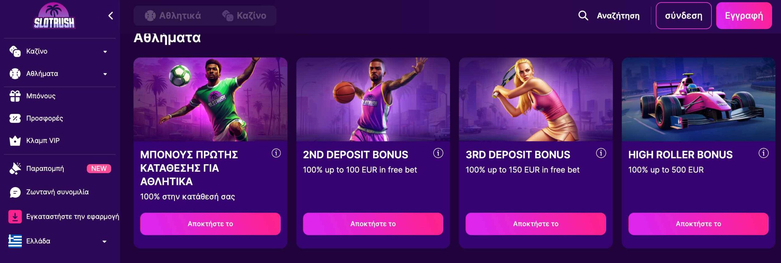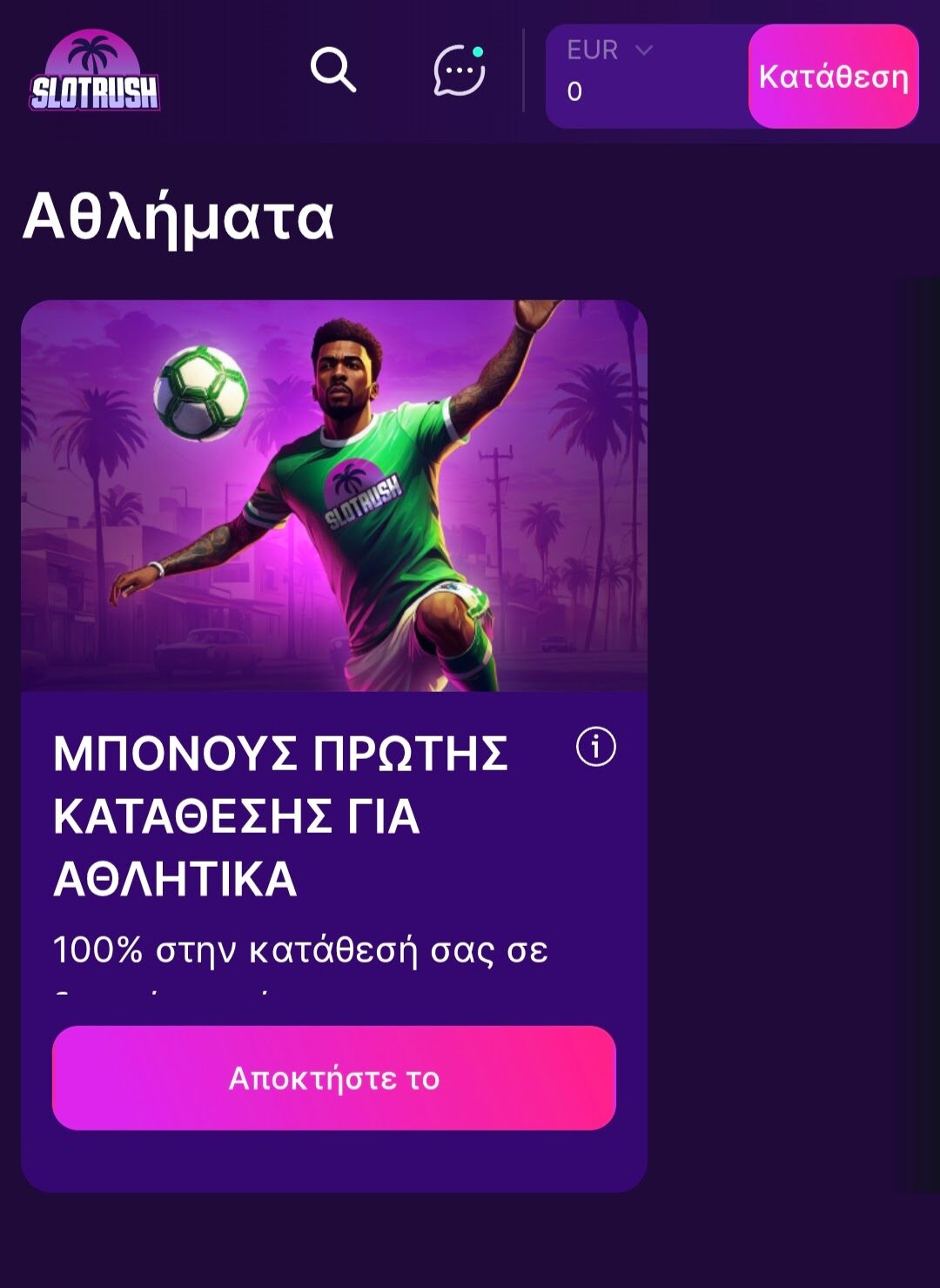 Η πλοήγηση συγκεκριμένα είναι τόσο ομαλή και άμεση που πραγματικά ξεχνάς ότι βρίσκεσαι στον browser και όχι σε native εφαρμογή. Αν το υποστηρίζει ο browser της συσκευής σας μπορείτε όμως να προσθέσετε το Slotrush ως συντόμευση στο αρχικό μενού του smartphone ή του τάμπλετ σας για ακόμα περισσότερη ευκολία. Στο sportsbook διατηρείται η ίδια λειτουργικότητα και ταχύτητα με τα διάφορα elements να είναι εύκολα προσβάσιμα και να ανταποκρίνονται αστραπιαία στις εντολές του χρήστη.